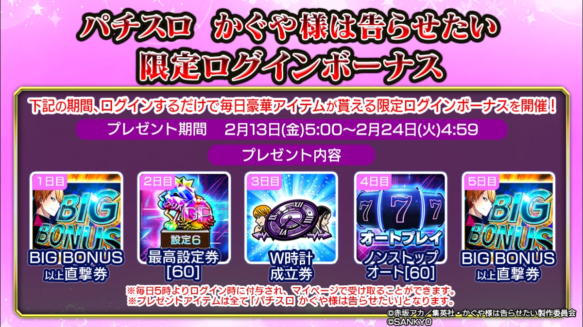 配信決定記念・期間限定ログインボーナスとして「パチスロ かぐや様は告らせたい」アプリで使用可能なアイテムをプレゼント。最大5日間のログインで「BIG BONUS以上直撃券」を含む全ての報酬を獲得できます。