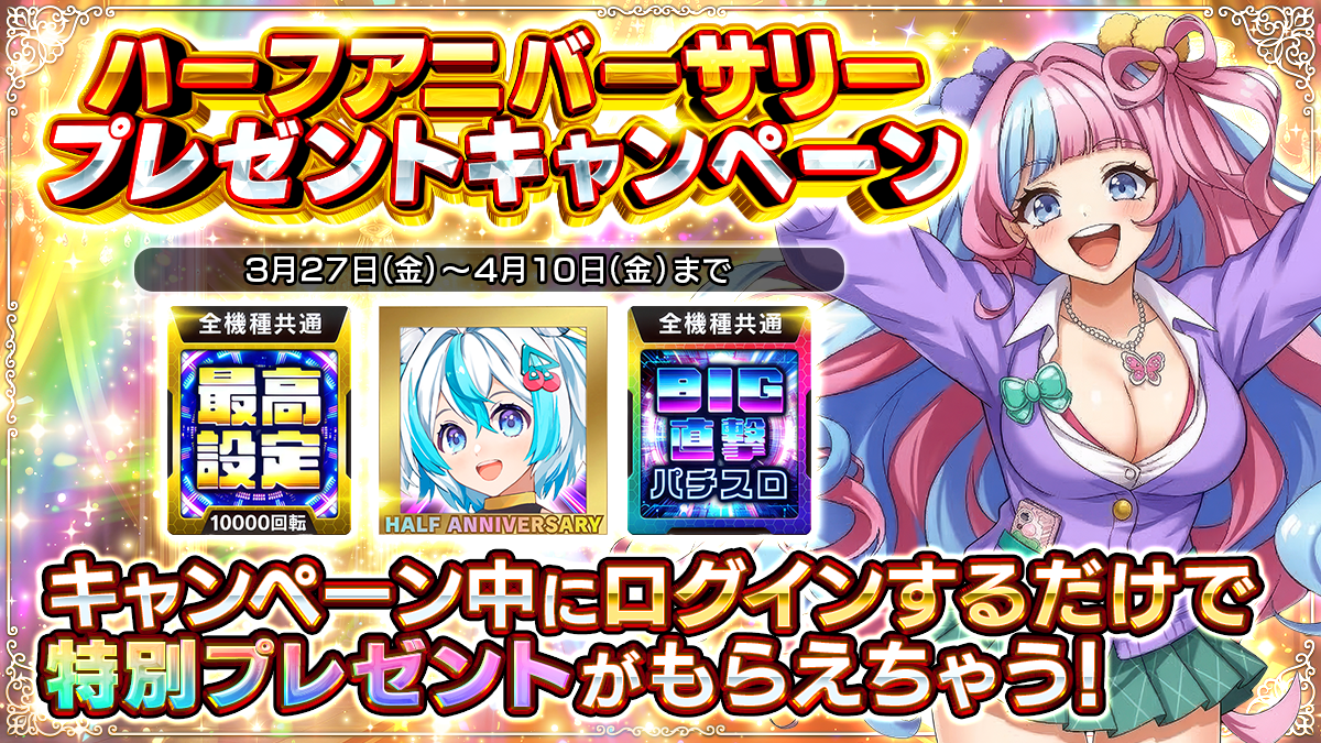 本イベントの開催に先駆け、本日より豪華報酬や高設定投入など、ハーフアニバーサリーを先行して楽しめる「ハーフアニバーサリー カウントダウンキャンペーン」を開始することをお知らせいたします。