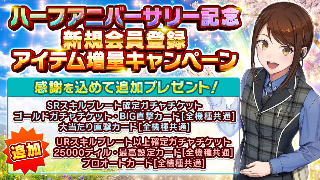 ハーフアニバーサリーを機に『スロスピ』を始める皆様に向け、スタートダッシュに欠かせないアイテムを大幅に増量して配布いたします。